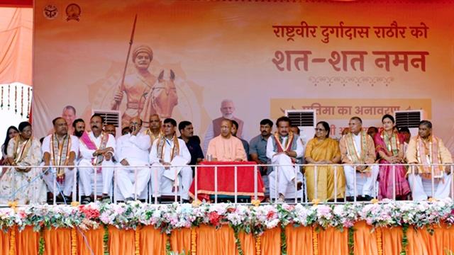 मुख्यमंत्री जी आज जनपद आगरा में राष्ट्रवीर दुर्गादास राठौर की अष्टधातु से निर्मित 15 फीट ऊंची प्रतिमा का अनावरण करने के पश्चात अपने विचार व्यक्त कर रहे थे। उन्होंने राष्ट्रवीर दुर्गादास राठौर की प्रतिमा के सामने स्थित उनके चित्र पर माल्यार्पण कर पुष्पांजलि अर्पित की। इसके पश्चात उन्होंने नजदीक ही स्थापित माँ अहिल्याबाई होल्कर जी की प्रतिमा पर माल्यार्पण कर उन्हें श्रद्धांजलि दी। राठौर समाज के गणमान्य व्यक्तियों द्वारा मुख्यमंत्री जी को मोमेन्टो प्रदान किया गया।