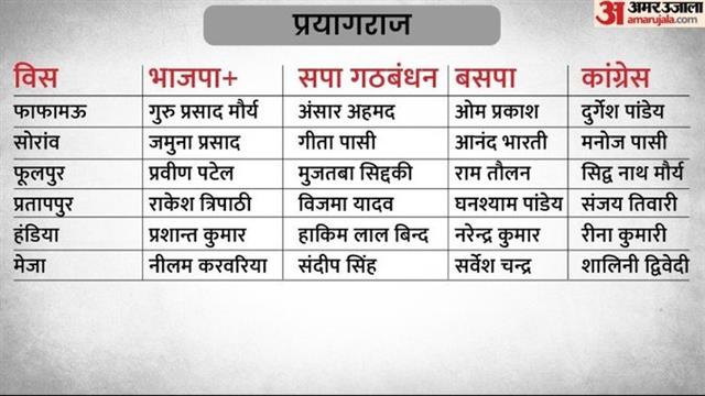प्रयागराज जिले की इलाहाबाद पश्चिम सीट से कैबिनेट मंत्री सिद्धार्थनाथ सिंह, इलाहाबाद दक्षिण से नंद गोपाल नंदी एक बार फिर मैदान में हैंं। 2017 में जिले की 12 सीटों में से आठ पर भाजपा और एक पर उसकी सहयोगी अपना दल को जीत मिली थी। दो सीटें बसपा और एक सीट सपा के खाते में गई थी।