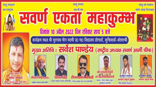 पूरा मामला सवर्ण एकता महाकुंभ का आयोजन 10 /4/2022 दिन रविवार को श्री भूत नाथ मौनी स्वामी आश्रम लौगावा कुम्हियावां कौशांबी में सवर्णों के प्रति सनातन संस्कृति का अस्तित्व बचाने के लिए हमेशा सवर्ण ही समाज को जागरुक करते रहें हैं और आगे भी करते रहेंगे सवर्ण आर्मी चीफ सर्वेश पांडेय जी ने यह भी कहा कि हम सवर्ण समाज के लिए हमेशा अग्रसर रहेंगे बता दें इस आयोजन में हजारों की संख्या में जन सैलाव जिसमें ब्राह्मण क्षत्रिय तथा वैश्य समाज के लोग बढ़ चढ़कर हिस्सा लिए और अपने समाज को जागरुक करने का एक मंच से संकल्प लिया वा आरक्षण के प्रति कड़ी आवाज उठाई और उन्होंने बताया कि जो आदि काल से ही ब्राह्मण वर्ग पूरे समाज का नेतृत्व करता रहा है उसको बहुत ही हेय दृष्टि से देखा जाता है और सवर्ण वर्ग का स्वाभिमान और अस्तित्व के खतरे को लेकर के विचार व्यक्त किए